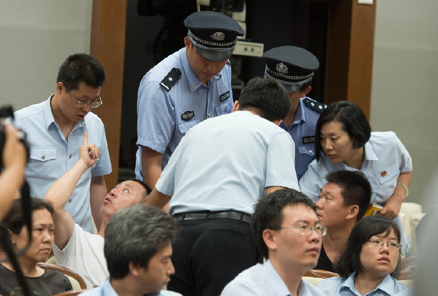 马彦鹏用小红的手机卡给舅妈发短信,内容为,“你女儿在我手上,想要回你女儿,50万。我是为钱,别逼我做什么傻事。你要是报警,或者让其他人知道,别想再看见你女儿。”小红的母亲证言显示,她当时回复,“你要钱可以,我要看我女儿是不是安全。”结果对方回复,“别和我废话,记住我说的,要报警就等着给你女儿收尸吧。”并给她发来照片,其中显示小红的嘴被白色毛巾捂着。反反复复,马彦鹏觉得事情弄大了,没有想得那么简单,就打算放弃要钱。他关掉表妹的手机不再和舅妈联系。怕女友晚上回来看到尸体,马彦鹏将表妹的尸体背出去,抛弃在附近公共卫生间的化粪池内。次日,马彦鹏在暂住地被警方抓。图为被害人家属旁听时情绪激动。