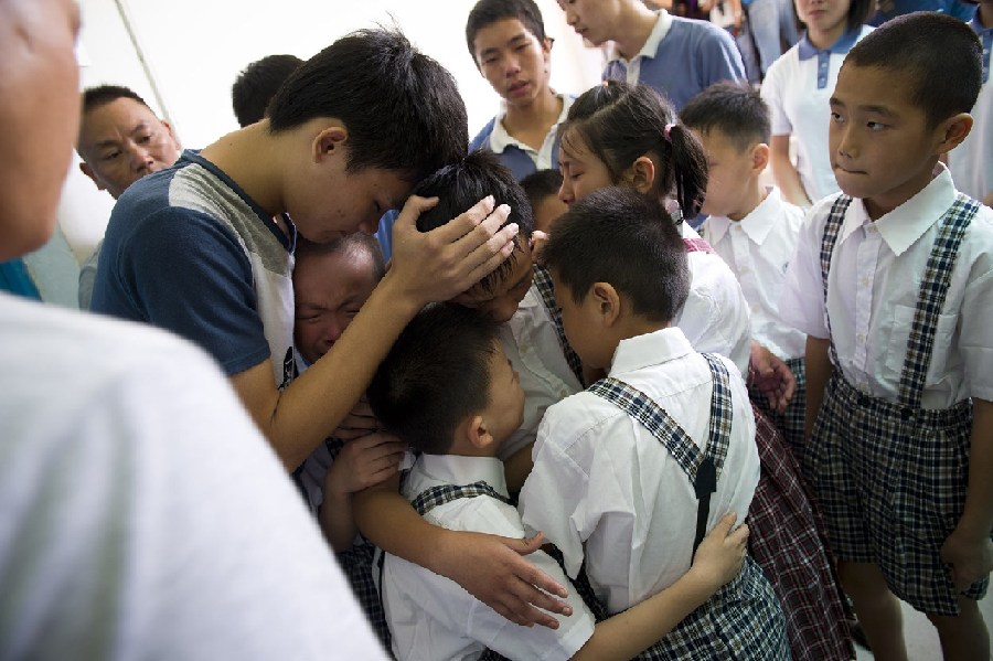 学生们紧追不放,几个女生把广西电视台记者堵住,不停问“他不是说不想回去吗,你们干吗还要把他带走”,记者也无言以对。在宿舍楼下,7岁的曾繁荣和几个国学班的小伙伴,因为追赶不上,坐在楼道上,号啕大哭。