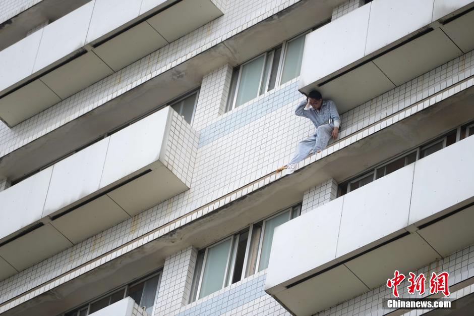 6月25日上午,患者向正在高楼边打电话。当日,湖南长沙市中心医院一位患者打坏八楼窗户爬出阳台准备跳楼,被消防官兵成功营救。据院方表示,该名患者因车祸入院,精神有异常状况。中新社发 杨华峰 摄