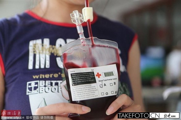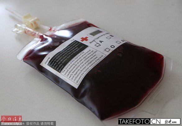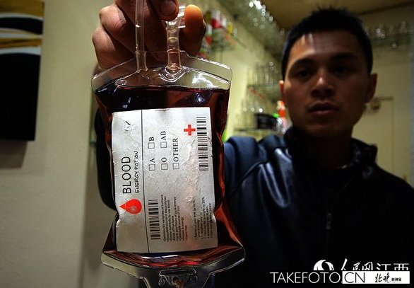6月25日,在辽宁省本溪市,咖啡店流行一种名为“血袋”的饮料。该“血袋”内的饮料为深红色液体,外包装则与医院里的血袋别无二致,还有类似悬挂血袋的小孔与调节流速快慢的阀门。外包装则用较大的字体标明“Blood Type Energy Supply” (血能量补给),以及大段落英文,并配有条形码和红十字标志,分蓝莓和蔓越莓两种口味,并且分“血型”。“病人”多为年轻人,大多出自好奇心理前来购买。该“血袋”标价人民币30元/袋。
