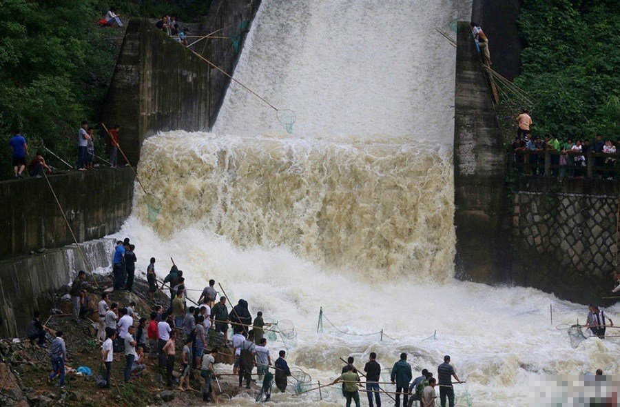 由于衢州连日来遭到多场强降雨袭击,衢州铜山源水库的水容量在达到固定水位后进行了自动泄洪。水库在泄洪时很多鱼也被冲了出来,附近村民纷纷涌到泄洪口捕鱼,捕到都是十多斤一条的大白鲢,据称自泄洪以来已有共计约15000斤鱼被捕获。