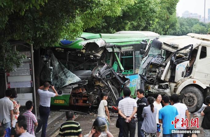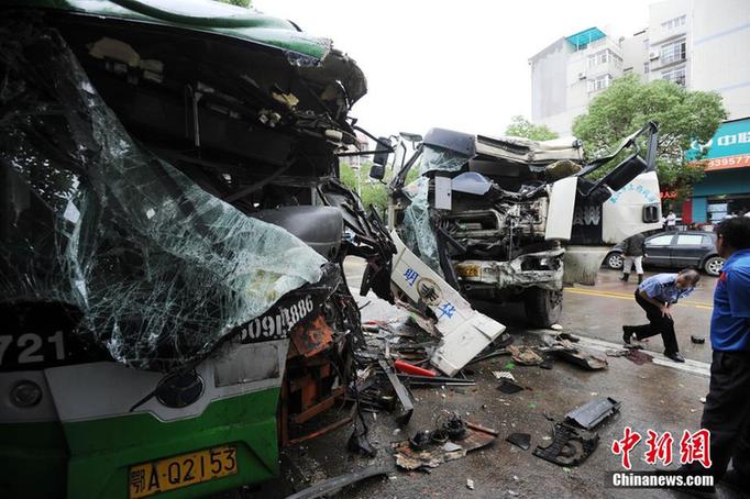 6月26日下午,武汉市常青花园学府路附近一搅拌车突然失控,撞上对面公交站正在上下乘客的721路公交车,致搅拌车司机被困,公交车20名乘客受伤,其中2人骨折、18人擦碰伤,无人员死亡。目前被困、受伤人员已全部救出并转移。中新社发 亮亮 摄 图片来源:CNSPHOTO