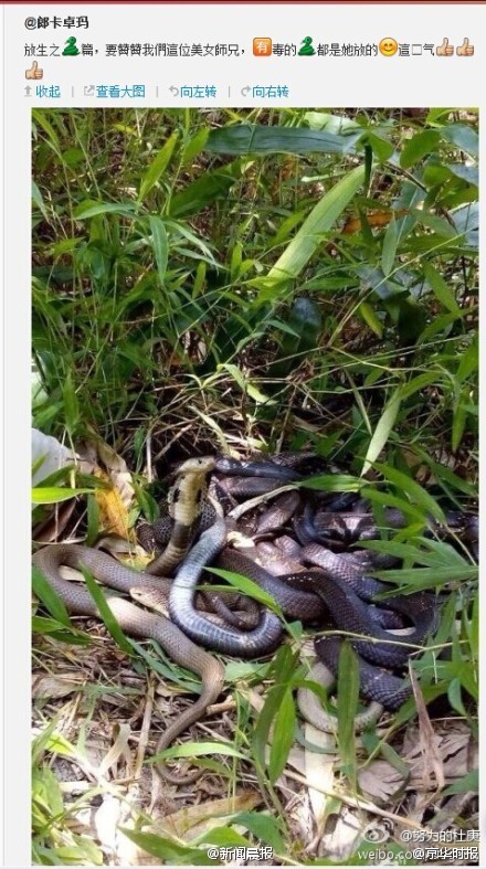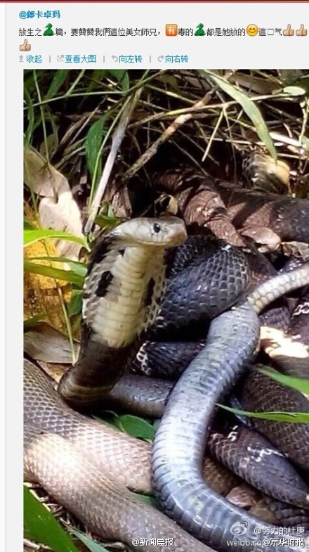 京华时报【网友在广东省一公园放生五步蛇眼镜蛇】@郎卡卓玛在其微博大秀放生祈福事件(微博已删),而放生的对象竟是毒蛇!据网友指认其中有五步蛇以及眼镜蛇等剧毒蛇种!而放生的地点是广东省内某公园!试想一下,如果去公园游玩或散步的居民不幸遭遇放生的毒蛇...这到底是积德还是造孽?