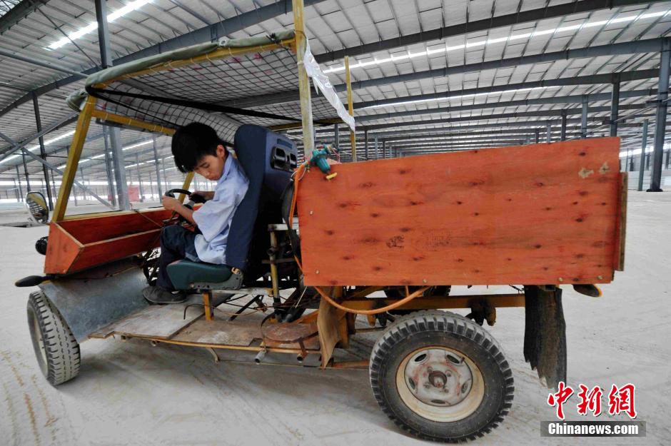 8月13日,在福建龙岩市武平县岩前镇产业园区,一名员工开着一辆奇怪汽车行驶在园区内。据了解,这是他利用摩托车的发动机等为零件,连续花了几个月的休息时间,总共花费7000多元制造而成的“山寨汽车”。 张斌 摄