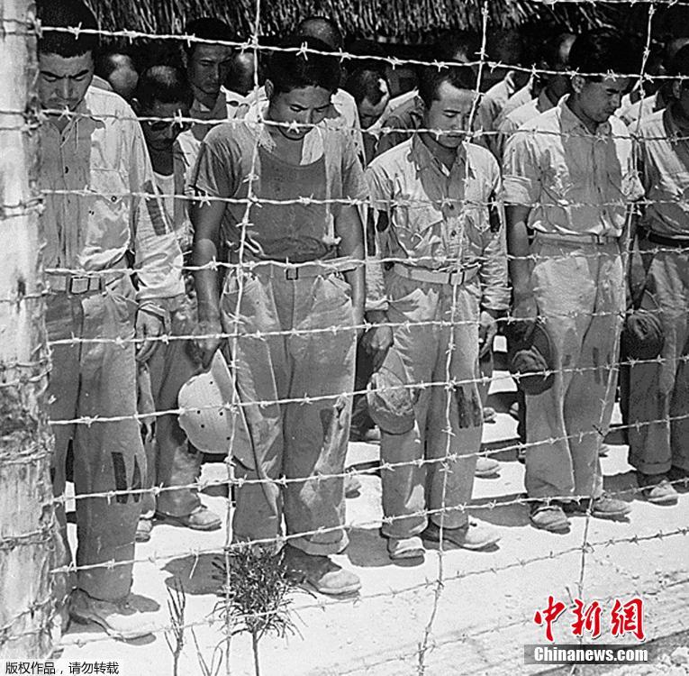 1945年8月15日在关岛的日本战俘,听到裕仁天皇让日本无条件投降的声明,结束了第二次世界大战后,低头鞠躬。