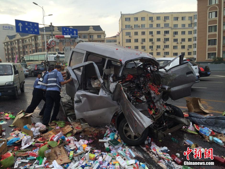 15日5时30分许,哈尔滨市文昌桥海城街下桥口处一辆面包车与一辆货车相撞,造成1人死亡,1人重伤。 中新社发 解培华 摄