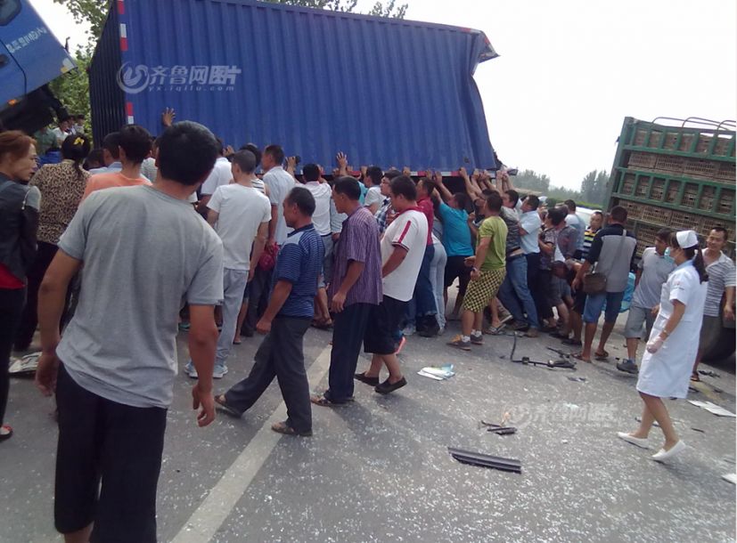 临沂两女子被卷入货车底部 数百群众抬车救人