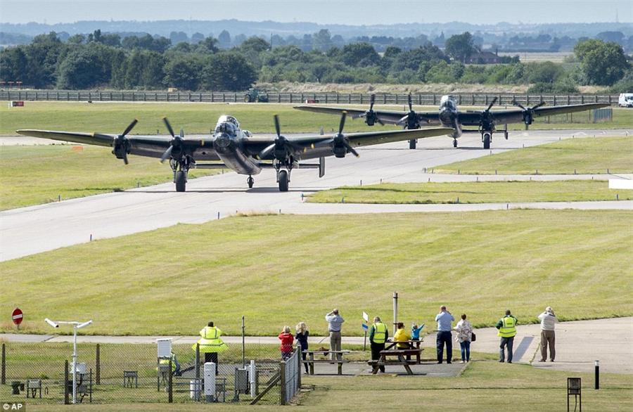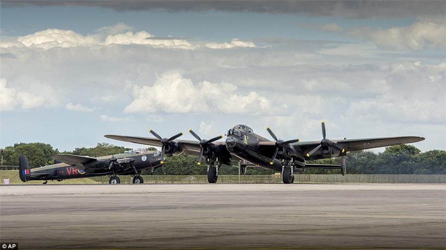 世界上仅存的两架兰卡斯特轰炸机在飞行后停靠在林肯郡机场的草坪上,这两架飞机是纪念英国皇家空军战役,被安置于加拿大安大略博物馆。