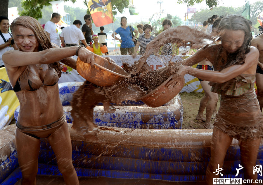 2014年08月21日,山东省济南市泉城公园,冰桶挑战赛现泥浆版,少女身穿比基尼,大盆的冰水泥浆从头顶倾斜而下,女孩们还在泥浆中摔跤,身上瞬间沾满泥浆,如同泥人雕塑。(秋芊/CFP)