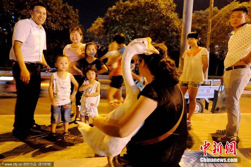 2014年08月24日晚,河南省洛阳市定鼎立交桥下,一位女士带着一只鹅出来遛弯,吸引了不少市民的注意力。这只鹅2岁,是该女士和家人从小养大。在周围玩耍的宠物狗对这只鹅很感兴趣,但都不敢靠近鹅。鹅有时候也会受到惊吓,立马拥进女士的怀里,头搭在该女士的肩膀上,看上去十分有趣。图片来源:CFP视觉中国