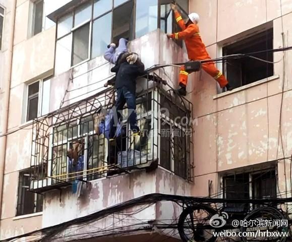 8月24日,哈市道里区河广街18号三单元301室一名老太从阳台坠落,卡在晾衣架上。紧急时刻,一名男子迅速爬到2楼阳台防护网上用肩擎住老人十多分钟,随后派出所民警与消防官兵赶到共同将老人救下。图片来源:哈尔滨新闻网官方微博