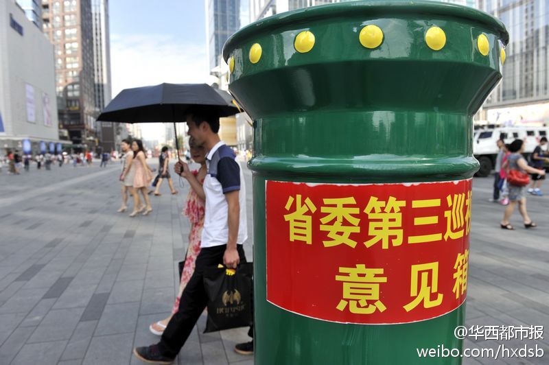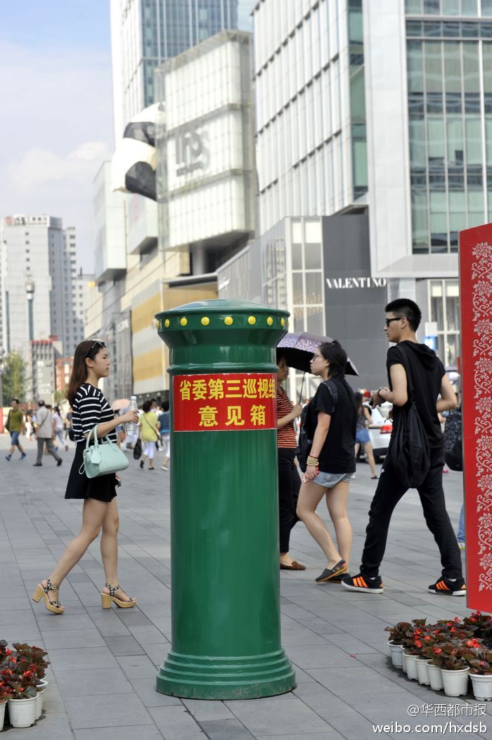 最近,在春熙路银石广场附近出现了一个特别显眼的绿色邮箱:四川省委第三巡视组意见箱。除了可直接投递意见信外,上面还标有举报电话和电子邮箱。亲,今后去春熙路,除了逛街,你还能再干点“你懂的”事了哈!记者 吴小川 摄影报道