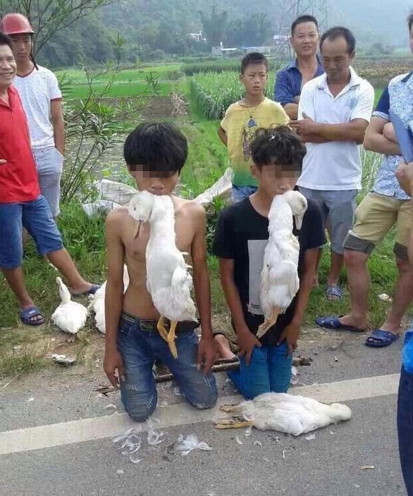 8月25日,宜州市庆远镇六坡村两名约14岁的少年,拿着编织袋窜到村里乘机作案,当发现一家农户在地里干活,10多只鸭散养在家门口后,两少年相互配合,把鸭子塞进编织袋里,然后扛着编织袋往宜州城区逃跑,可还没逃出村口,两人就被发现了,并被村民逮了个正着。抓住两人后,村民们没有报警,而是对两少年进行了体罚。他们首先强迫两人用嘴咬住鸭子颈脖,跪在路边示众,一位村民觉得这样还不够泄气,又把两只鸭子的脚绑起来,加挂在两人的颈脖上,变成了每人“挂着”三只鸭子跪在路边。