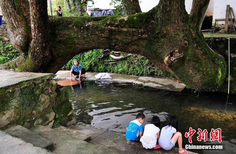 2014年8月30日,江西省婺源县镇头镇磻坑村村口有一棵古樟树横卧在村口的小溪上,当地人称它为“树拱桥”。这棵古樟树距今都已500多年,依然枝繁叶茂,村民把它当作村里的树神。过去,一些村民为了出入方便,经常从这座古樟“桥”上经过,如今该村为了保护这棵奇特的古树,禁止村民从树上面行走。图片来源:东方IC