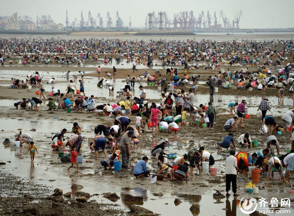 近日,日照岚山多岛海景区西侧海域,海水退潮后惊现万人“拾蛤大军”,长达3公里的海滩人满为患,竞相拾白蛤。据了解,万名“拾蛤大军”均来自附近村庄,这片水域白蛤原是人工放养,主人因故弃养,以致造成万人分享的热闹场景。 图片来源:齐鲁网