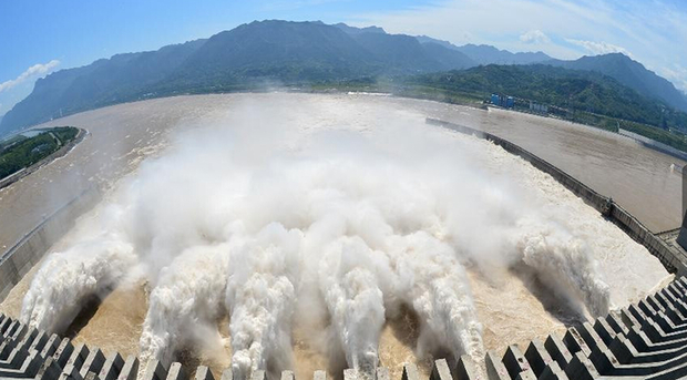 9月3日,摄影师在三峡大坝前拍摄正在泄洪的三峡枢纽。长江防总9月3日表示,由于上游地区连降暴雨,三峡水库2日凌晨出现今年入汛以来最大入库洪峰。长江防总兼顾防控洪水风险与航运需求,要求三峡集团公司2日开始加大出库流量,三峡水库迎来今年首次开闸泄洪。
