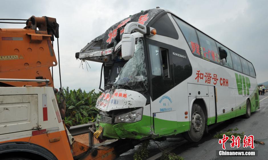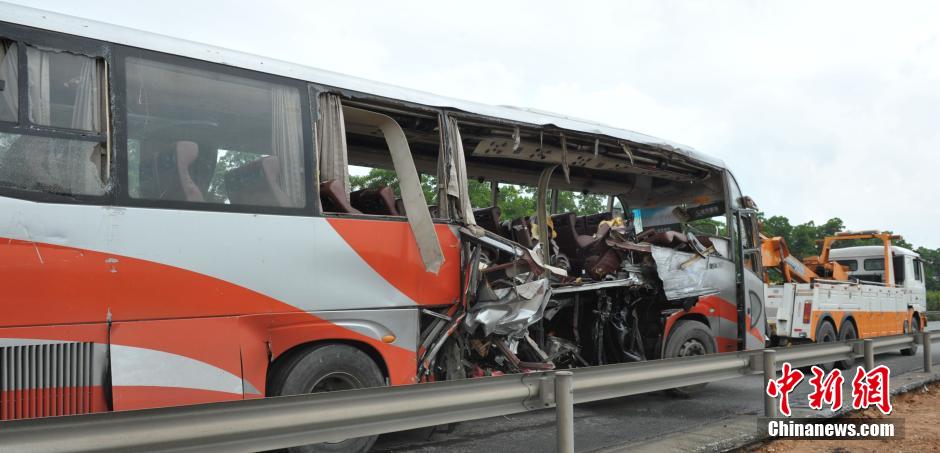9月8日上午8时31分,广东肇庆辖区G80广昆高速公路46KM+200M处,发生交通事故,一辆由东向西行驶的大客车追尾一中型货车后,越过中心护栏,与对向车道由西向东行驶的一大客车发生迎面碰撞,3车损坏。事故造成5人当场死亡,2人重伤,经送医院抢救无效死亡,另有18人受伤人员中,3人伤势较重。中新社发 黄耀辉 摄