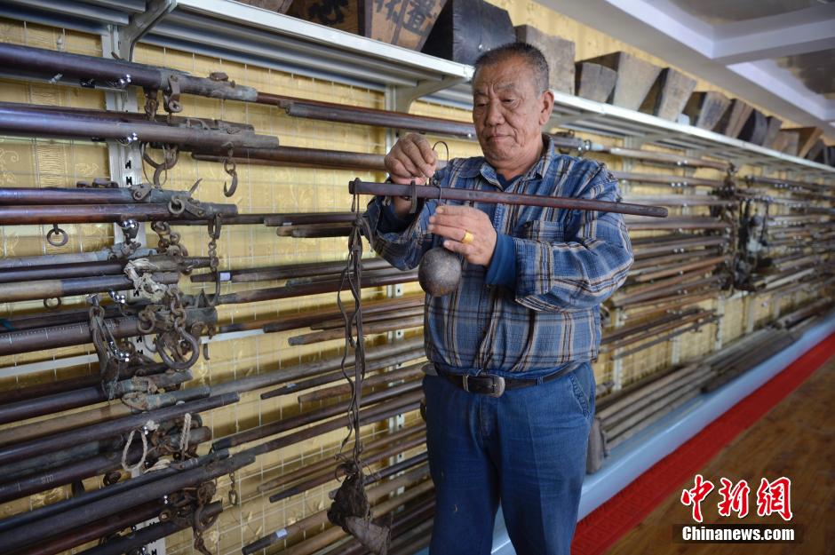 9月10日,内蒙古呼和浩特一古秤收藏家把玩古秤杆,据悉,该藏家收藏古秤,秤砣500多个,秤杆三百多杆,以明清时期古秤为主,最重一秤砣能称177担,约9000公斤。刘文华 摄