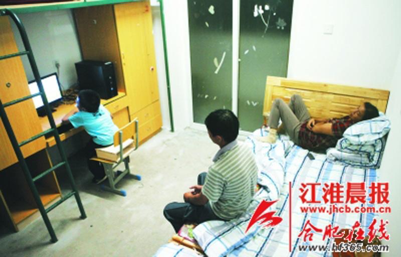 方进军在寝室玩电脑,母亲躺在床上休息。