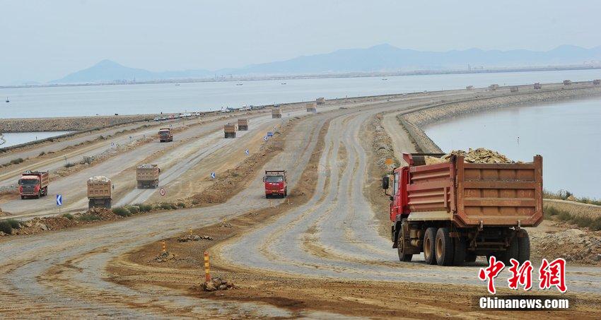 图为9月14日,众多运输土石方重型卡车穿梭在辽宁省大连新机场建设工地。