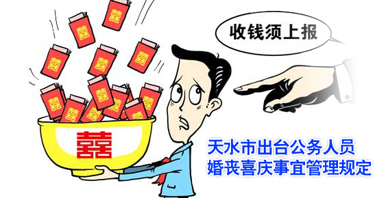 日前,为更好地落实中央“八项规定”的要求,天水市纪委结合实际,制定出台了《天水市公务人员人员婚丧喜庆事宜管理规定》,对党员干部操办婚丧喜庆事宜予以严格规范和监督约束。