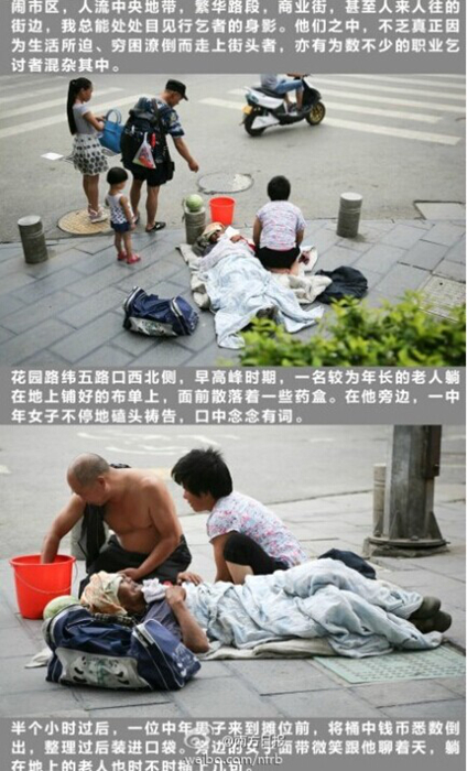 乞丐有真有假。一家人出工,早点吃汉堡,中午买牛肉和啤酒补充能量,一瓶冰镇啤酒倒瓶里佯装是药喂给躺着的人。下午茶是西瓜、冰棍和红茶,一天工作结束后美滋滋数钱数到手软。晚饭在一家饭店点了几个鸡腿和几瓶啤酒。饭后,逛Cartier卡地亚看了腕表。(来源:南方日报)
