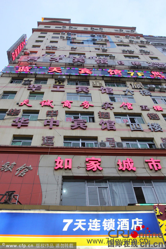 2014年9月17日,湖北武汉,关山口某名牌大学大门前马路对面一栋十多层的楼房里开了10多家宾馆,被网友称为“开房大厦”。图片来源:CFP