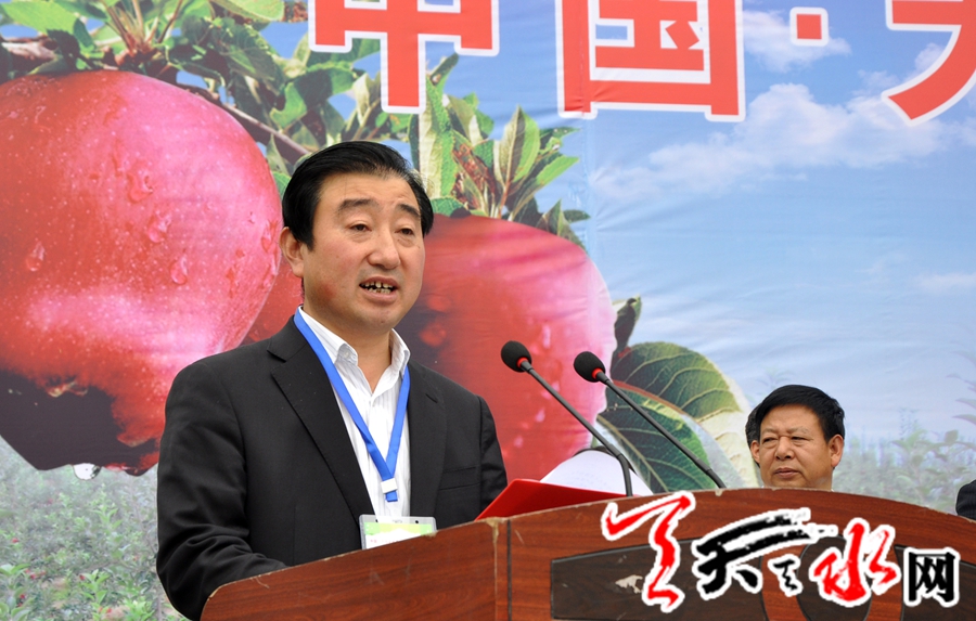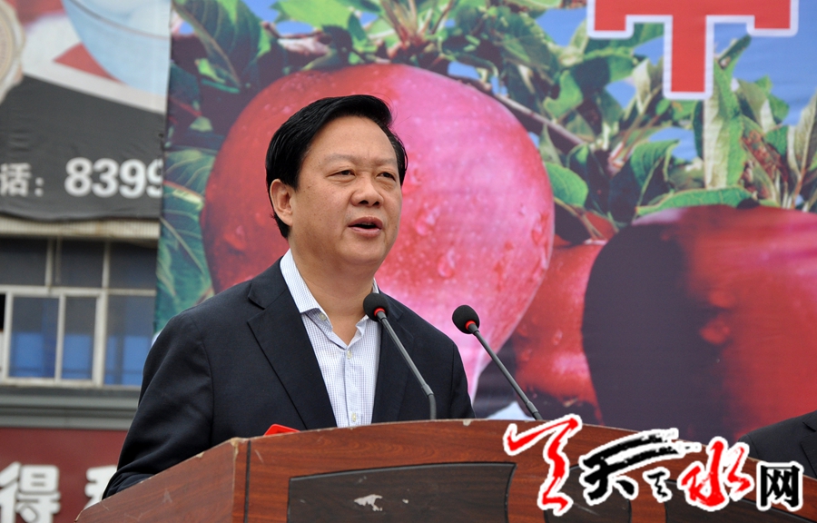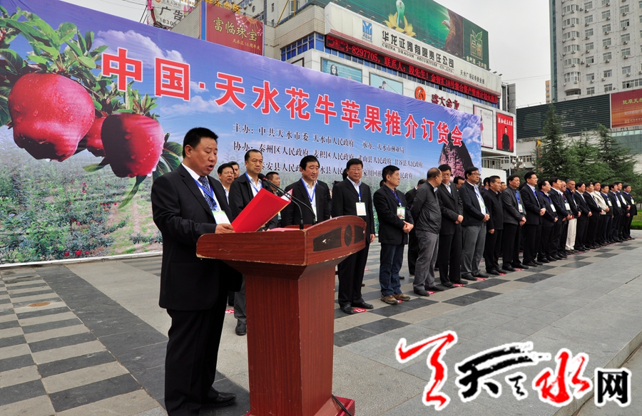 市委副书记、市长杨维俊在致辞中代表市委、市政府向参加推介订货会的各位来宾表示欢迎,向多年来关心支持天水经济社会发展的各界人士表示衷心的感谢。他说,天水是花牛苹果的故乡,花牛苹果是天水果品的典型代表,和美国蛇果、日本富士一道成为世界三大苹果品牌。我们举办这次推介订货会,目的就是要广泛宣传推介花牛苹果品牌,加强产销对接,拓宽营销网络,提升天水果品的知名度和市场竞争力。希望各位领导和专家对我市果品产业发展多提宝贵意见建议,各位客商全面了解花牛苹果的品牌优势和市场前景,加大市场营销力度,促进天水果品产业快速发展。