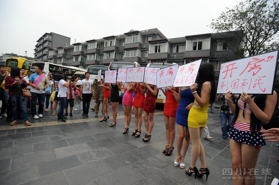 9月21日下午,市民张先生通过网络爆料称,成都宽窄巷子附近有多名女子穿着暴露,还手举“‘开房’利国利民”的牌子,引来不少游客围观拍照。