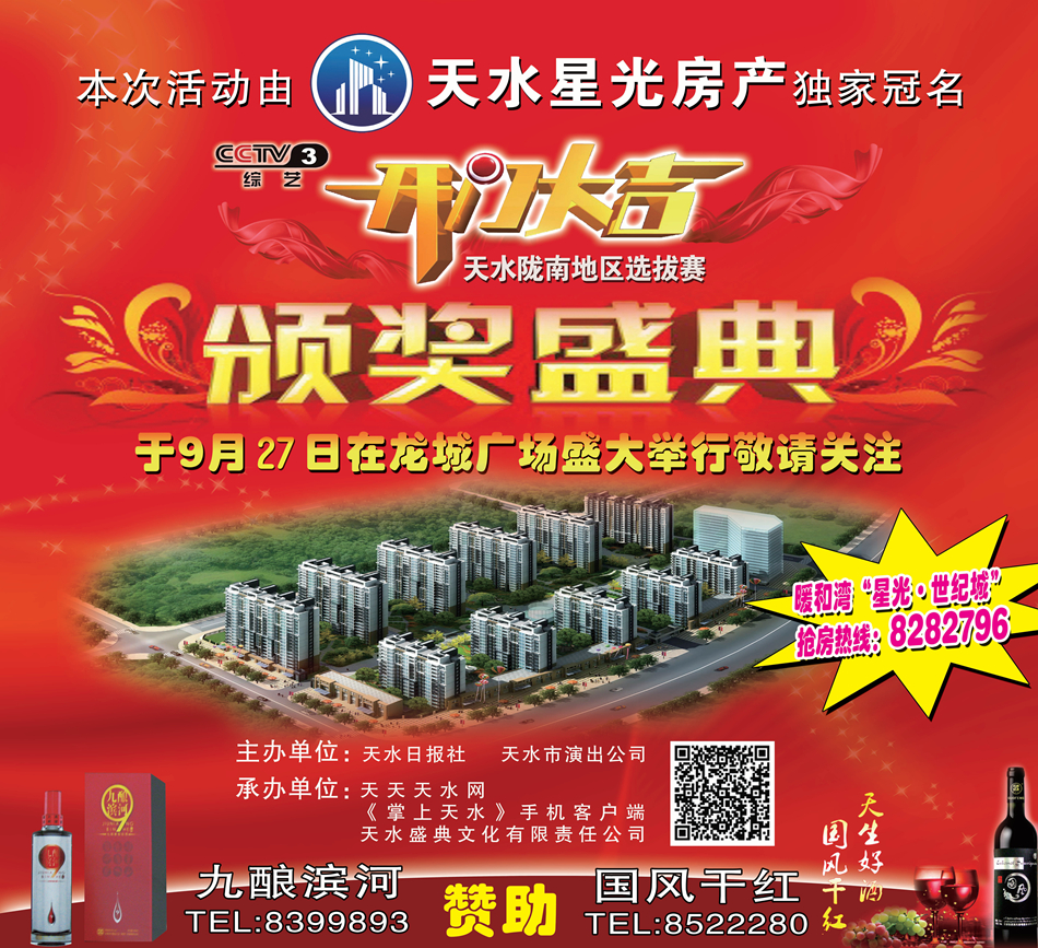 2014中央电视台《开门大吉》甘肃选拔活动由中央电视台综艺频道节目部、省委宣传部、省精神文明指导建设委员会办公室、省广播电影电视总台、省文化厅、省教育厅等单位联合举办。其中天水陇南赛区由天水日报社和天水市演出公司主办,《掌上天水》手机客户端、天天天水网和天水盛典文化有限公司承办,天水星光房地产开发有限公司独家冠名,由甘肃滨河国风干红和九粮天脉品牌营销公司赞助,旨在为“开门大吉”栏目选送助演嘉宾。选拔赛于今年7月启动后,先后有220多名选手参加海选,经过各县区海选,复赛,决赛最终选出了牛旦、侯婷等十佳选手。这十名优秀选手经中央电视台各栏目组导演现场总选拔面试点评合格者,将入选中央电视台《星光大道》栏目备用选手库。