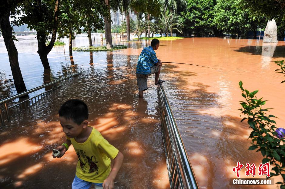 南宁邕江迎洪峰公园被淹 市民水中淡定钓鱼