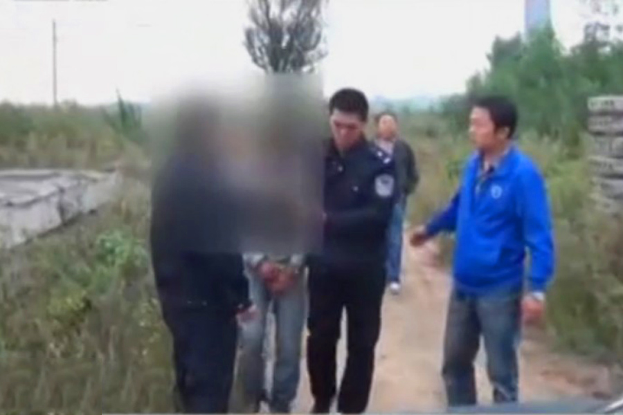 在实施强奸后,犯罪嫌疑人张某怕刘某报警,便用砖头朝刘某头部猛砸数下,并用裤子勒刘某脖子,导致其死亡。张某回到家后,将事情经过告诉其父亲,后在其父劝说下投案。图为犯罪嫌疑人张某在案发现场指认。