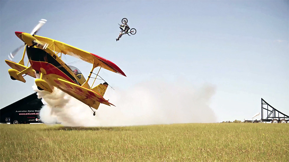 据悉,Joel Brown是澳大利亚自由摩托越野赛的冠军,已有5年的驾驶经验,但他透露这是自己第一次真正的特技表演,“我以后还会追求更多这样的经历”。在安全措施方面,Brown表示,“我得先确认飞机产生的风会不会影响到我,而且要控制好自己的速度以免在斜坡上摔车。飞行员Paul也要保证能够完成低空飞行。只有完全做好安全工作,你才能看到如此精彩的表演。”