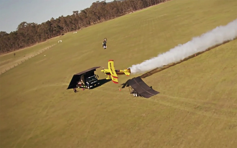 Joel Brown驾驶摩托从低空飞行的飞机上空一跃而过(视频截图)