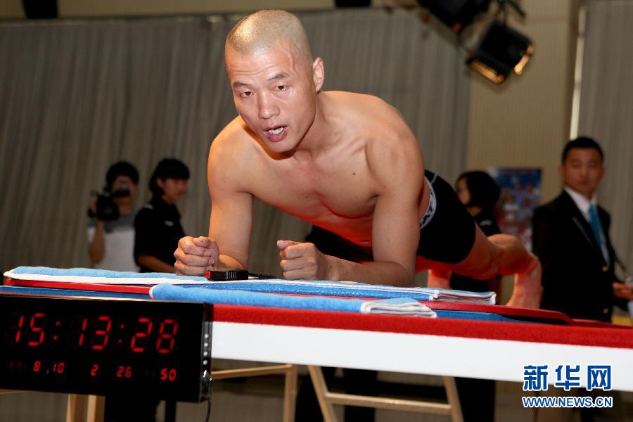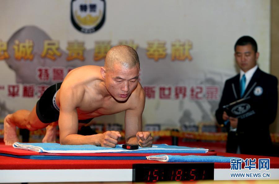 9月26日,北京市公安局特警总队特警毛卫东挑战“平板支撑”纪录。当日,经吉尼斯总部工作人员现场认证,北京市公安局特警总队队员毛卫东以“平板支撑”4小时26分的成绩打破原有的3小时07分的纪录,创造了“平板支撑”项目新的吉尼斯世界纪录。新华社发(谭志勇 摄)