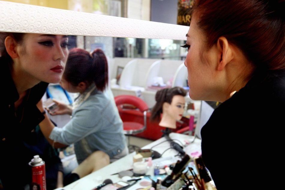 走场的时候特别累,只能在后台稍稍休息一下,小玲说,睡眠不足成了我们的职业病。没事的时候一觉能睡到中午十二点小谢说。其实我们这些靠车展和走秀的模特毕竟和职业模特不一样,说句实话有时候出去表演的时候都感觉自己向动物园里的动物一样让人围观,个别目的不纯的人经常做一些令人不齿的动作和行为,有时候想想真不想干了,小玲说道。图为玲看着已经化好妆的自己。