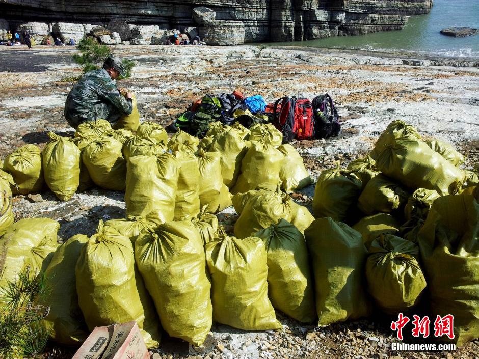 11月3日,青岛蓝天救援队和部分环保志愿者一起,来到崂山尚未开发的旅游景观八仙墩进行垃圾清理,现场画面让人震惊,方圆一个足球场大小的范围内,垃圾遍地,带去的77条大包装袋用完还没有运走所有的垃圾。据了解,每年青岛蓝天救援队都会和环保志愿者一起到崂山八仙墩景观清理垃圾。往年清理八仙墩的垃圾也就十来袋子,而今年的垃圾却特别多,参与垃圾清理的队员和志愿者都感到无比心痛,呼吁游客要爱护环境,不随手丢弃垃圾,还大家一个整洁、干净的崂山。图为志愿者将大批垃圾集中打包准备运送下山。 中新社发 王海滨 摄 图片来源:CNSPHOTO