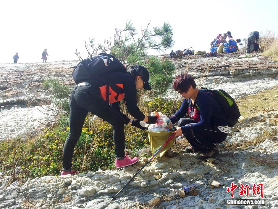 图为环保志愿者在崂山八仙墩捡拾被游客丢弃的垃圾。 中新社发 王海滨 摄 图片来源:CNSPHOTO