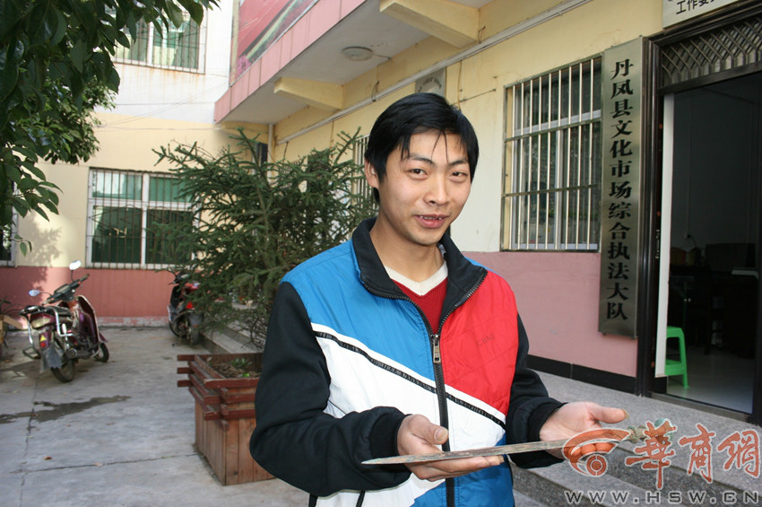 昨日下午,华商报记者在丹凤县文化执法大队见到了李磊捡到的古剑,剑体长46.5厘米,宽4厘米,重约610克。剑体部分呈现白亮色,靠近剑柄部分呈青绿色,剑刃呈锯齿状,剑柄末端刻有花纹。