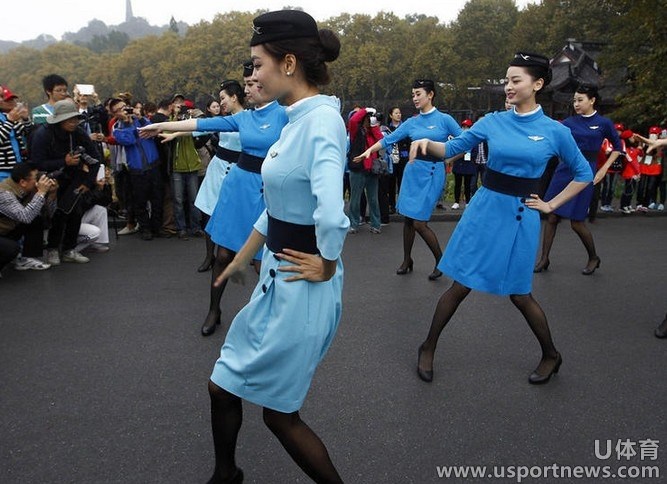 昨日杭州西湖断桥,一群空姐正在跳小苹果为杭州马拉松助威。