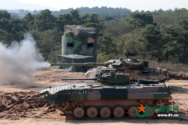 坦克和步战车在发射阵地对敌实施射击。