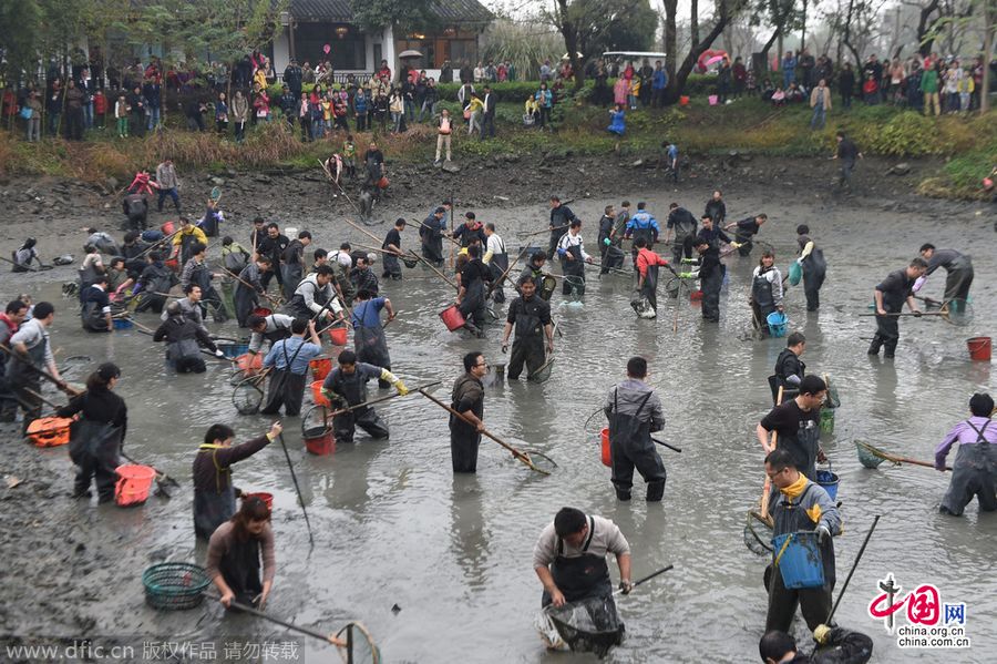 中国网11月10日讯 2014年11月9日,杭州西溪湿地-洪园举行干塘节。车水干塘捕鱼是由来已久的民间习俗,清挖池塘、抽水捕鱼,一家干塘,众邻帮忙,捕鱼捉虾,你争我抢,一派丰收喜庆景象。