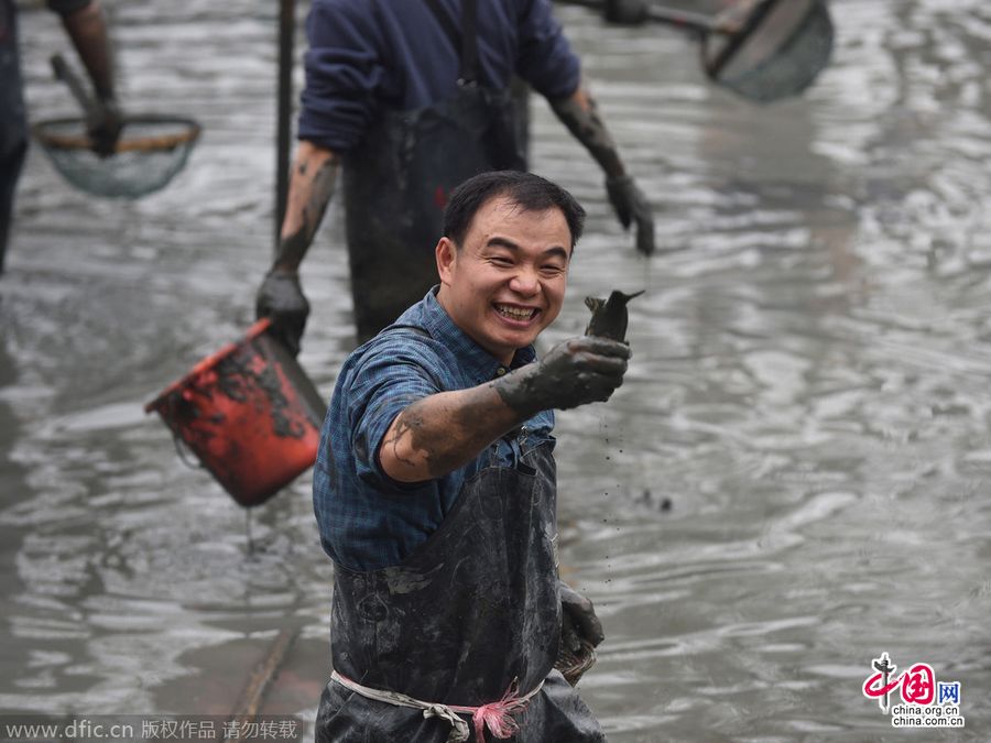 中国网11月10日讯 2014年11月9日,杭州西溪湿地-洪园举行干塘节。车水干塘捕鱼是由来已久的民间习俗,清挖池塘、抽水捕鱼,一家干塘,众邻帮忙,捕鱼捉虾,你争我抢,一派丰收喜庆景象。
