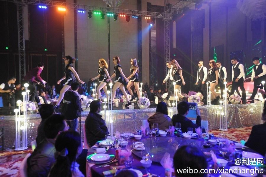 据荆楚网微博报道,11月8日,武汉洲际酒店现豪华跑车婚礼。法拉利、玛莎拉蒂、奥迪等五辆豪华跑车分布婚礼宴会大厅内外,其中一辆粉色法拉利开上婚礼主舞台,配合新人与伴娘、伴郎们合演的歌舞秀。图片来源:荆楚网微博