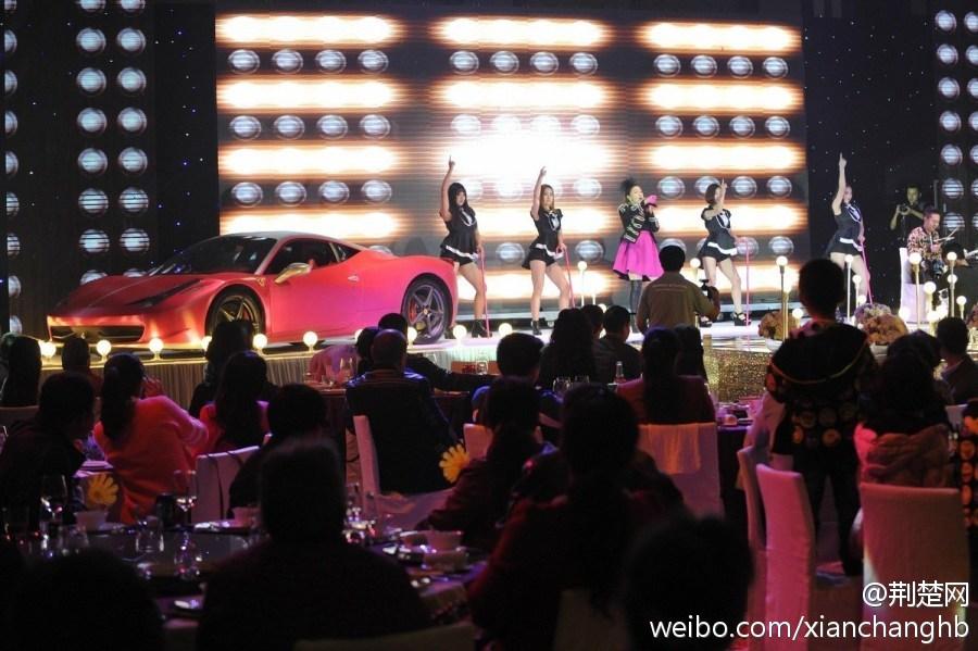 据荆楚网微博报道,11月8日,武汉洲际酒店现豪华跑车婚礼。法拉利、玛莎拉蒂、奥迪等五辆豪华跑车分布婚礼宴会大厅内外,其中一辆粉色法拉利开上婚礼主舞台,配合新人与伴娘、伴郎们合演的歌舞秀。图片来源:荆楚网微博