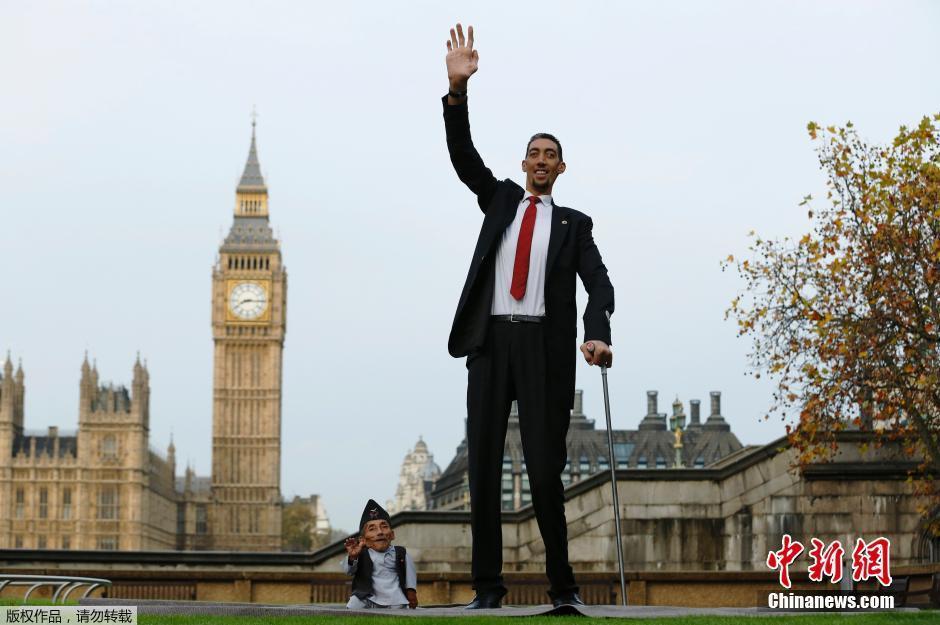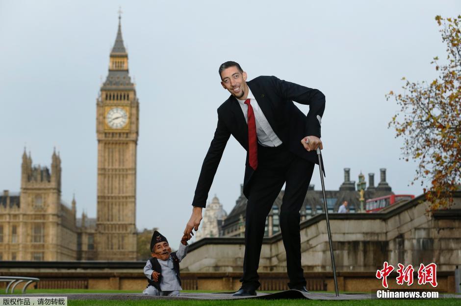 当地时间11月13日,全世界最高的男人,2米51的苏丹·克森(Sultan Kosen)和世界上最矮的男人,身高仅0.546米的坎德拉·巴哈杜尔(Chandra Bahadur Dangi)共同亮相伦敦,庆祝第60版吉尼斯世界纪录问世。