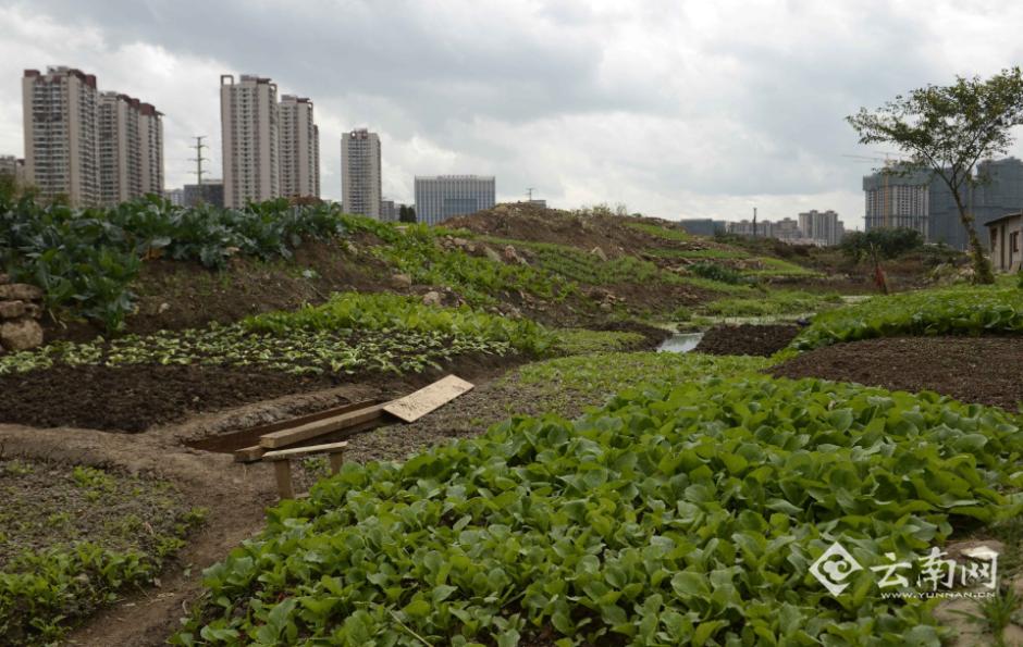昆明南二环附近,干枯的清水河里种满了各种蔬菜。