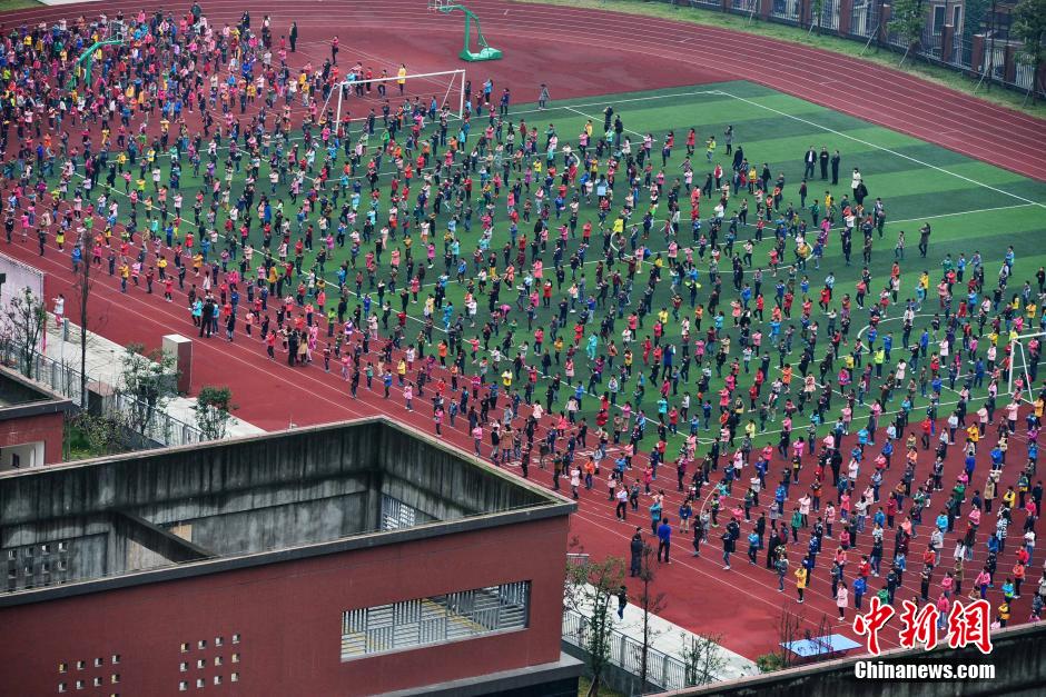 2014年11月18日,重庆渝北学生在“空中操场”做课间操。近日,各地一些学校“空中操场”再度引发关注,一些家长还是担忧孩子在学校的安全。中新社发 吉云 摄 图片来源:CNSPHOTO