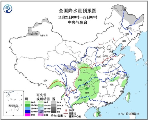 21日08时至22日08时,新疆西北部、黑龙江北部、青海东南部等地有小到中雪或雨夹雪,其中,新疆天山地区西部的部分地区有大雪;西南地区东部、陕西南部、湖南西部、湖北西部、广西北部、海南岛东部、浙江东部等地有小雨或阵雨,局地中雨。