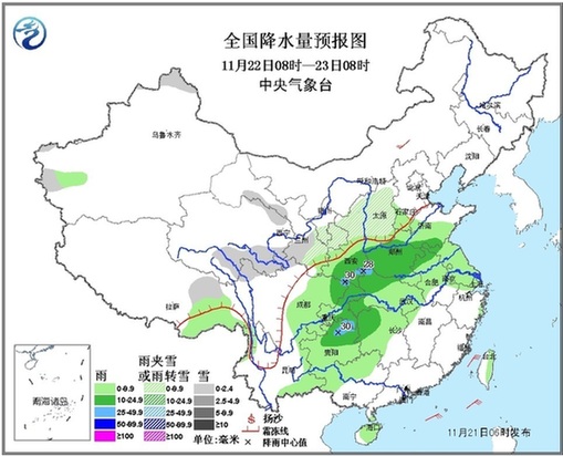 22日08时至23日08时,新疆西部、西北地区东部、山西、西藏东部等地的部分地区有小雪(雨)或雨夹雪;西南地区东部、华北东南部、黄淮、江汉、江淮、江南西部、广西西部、海南、台湾等地有小到中雨,局地大雨。